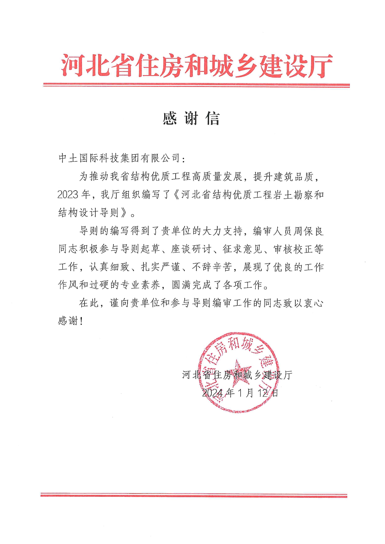 近日,河北省住房和城鄉(xiāng)建設(shè)廳給集團(tuán)發(fā)來(lái)感謝信,對(duì)集團(tuán)的大力支持以及參與《河北省結(jié)構(gòu)優(yōu)質(zhì)工程巖土勘察和結(jié)構(gòu)設(shè)計(jì)導(dǎo)則》編寫(xiě)的周保良等同志表示真摯的感謝。